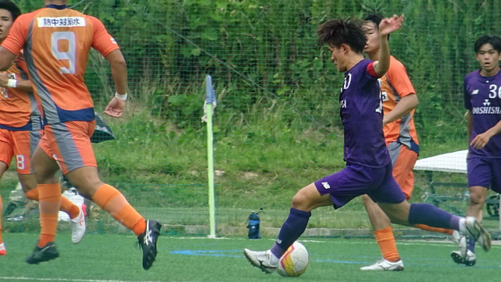 後半4分、同大が自陣深い位置でのパス回しから#20吹田航晟が前方へ大きくフィード。#9野頼駿介が相手に寄せられながらも敵陣PA右角まで進入しバックパス。#11馬場啓太朗が逆サイドへ振ってPA左角で受けた#14中山織斗がPA内#10鹿取勇斗とのワンツーからカットインして右足のコントロールショット。ボールは惜しくも枠の右上に外れる。