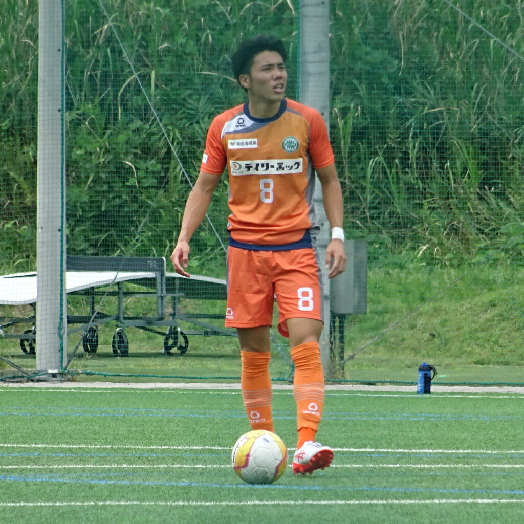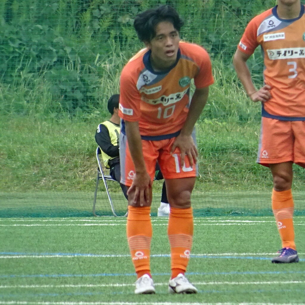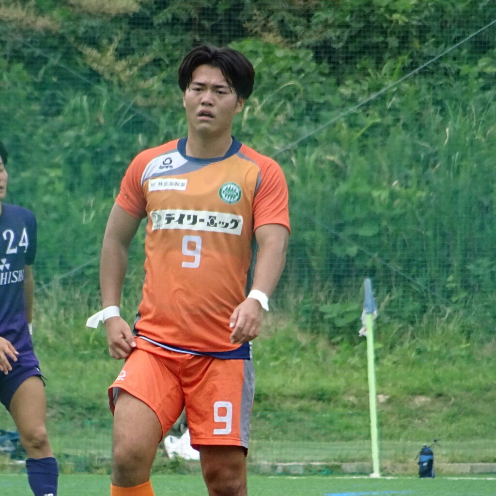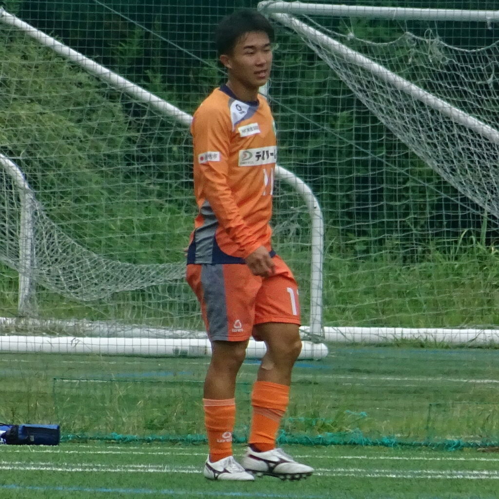 前半43分、関福大がセンターサークル内からのFK。#8茂木碧生が縦に浮き球のキック。右ハーフレーンPA手前で#9城洸佑が相手に寄せられながらも手前に落とし、前向きで受けた#10松下貴要がエリアの外から左足で低いシュートを放つも同大GK#41黒瀬理仁が素早く体を倒してキャッチ。