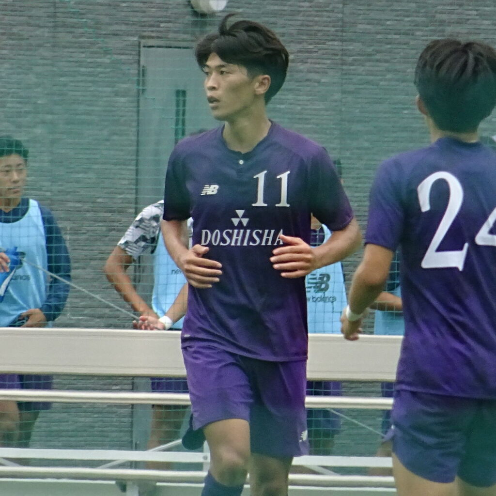 後半37分、関福大が攻め込み同大がクリア。センターサークル内で高く弾んだボールを関福大・#57矢野陸が収めようとするところに同大が二人で寄せるも、これをかわしてドリブルで前進。右を並走する#11春木慎之介へ横パス。#11春木がPAに差し掛かりそうになるその前方で#10松下貴要が左から右へ横切りコースを空けると#11春木が右足のシュート。しかし枠の左へ外れてしまう。