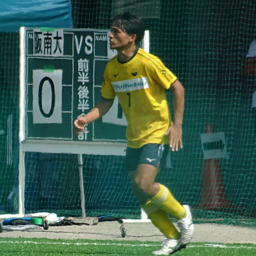 後半45+3分、阪南大・#28松井空音が中盤自陣右サイドから敵陣左ハーフレーンへ斜めのロングキック。#23篠田純之助が拾ってPA左から左足のシュートは右ポスト。跳ね返ったボールに#10金本毅騎が詰め胸に当てるもこれも右ポスト。こぼれ球を甲南大がクリアしタッチへ逃れる。