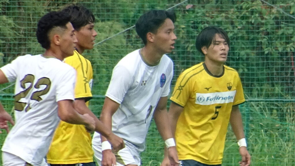 前半45+2分、甲南大が敵陣ゴールエリアやや右からの間接FK。#18諏訪晃大がさわって#10泉彩稀が左足で力強く蹴りこむが寄せる相手より先にさわる意識が強すぎたか枠の上。