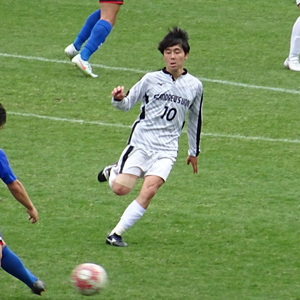 後半5分、桃山大のCKを京産大がクリア。桃山大がボールを収めるも京産大が積極的にプレス。桃山大がサイドに展開したところを京産大#2沖野眞之介がカットし右サイドから中央へとドリブルでぐいぐいと前進。#14大倉慎平を経由し#10皿良立輝へ。#10皿良が敵PA右角から左足グラウンダーシュートはGKキャッチ。